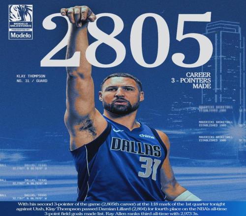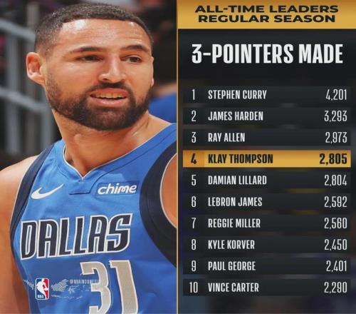 克莱生涯三分命中数(2809)超越利拉德(2804记),升至NBA历史第四位,仅次于库里、哈登和雷阿伦。克莱本赛季场均命中2.9记三分,按照这个速度来算的话,他想超越雷阿伦得等到下赛季了。当然那都是后话了,今天先祝贺克莱。